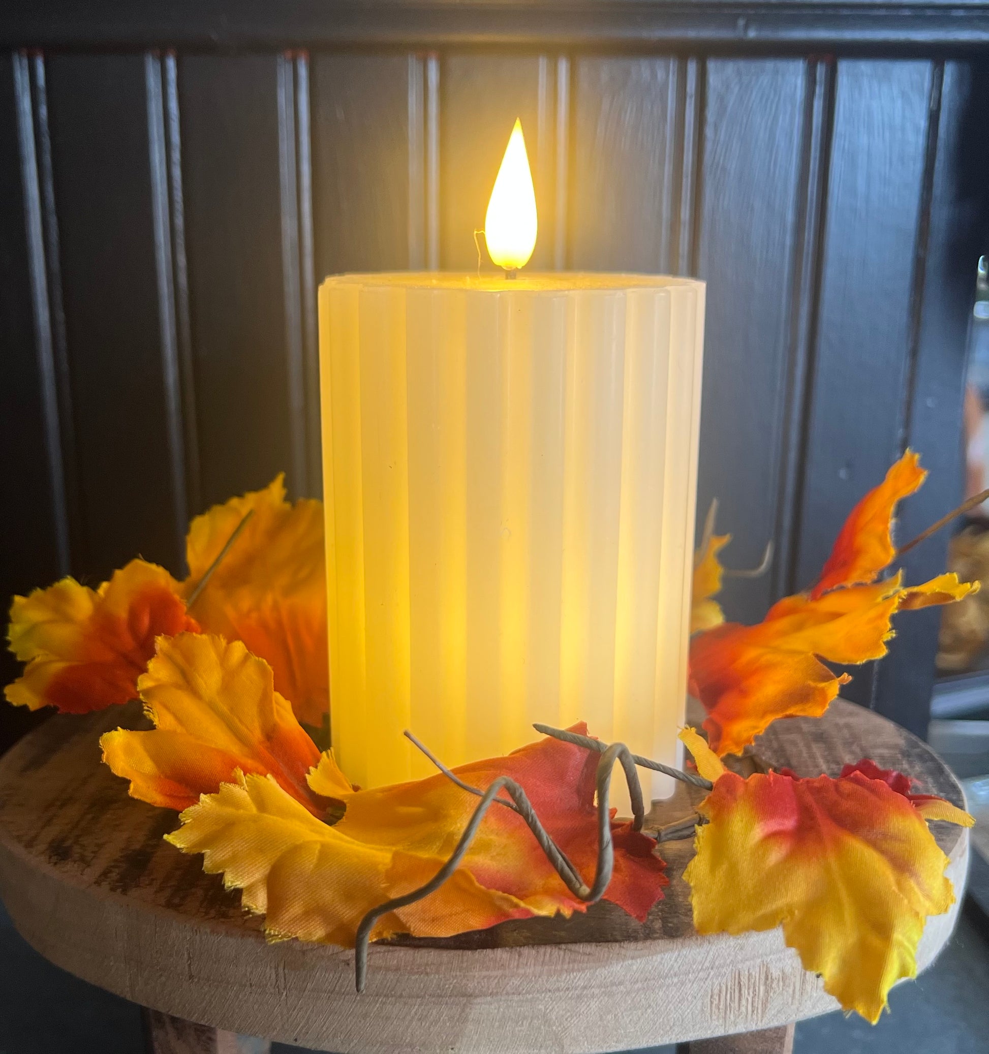 Orange gold maple leaf candle ring. Each ring has a 3.5 inch inner dimension and is 8 inches across.